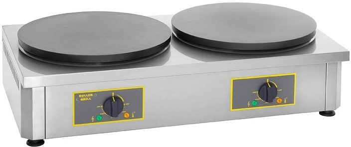 Блинница Roller Grill CDE 400 с электрическим нагревом оснащена двумя гладкими рабочими поверхностями диаметром 40 см. Они выполнены из чугуна со специальным покрытием и имеют независимое управление. Это обеспечивает равномерный нагрев и возможность жарить блины с минимальным количеством масла.
