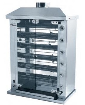 1297x585x1316 мм, Рамная конструкция, цепная передача вращения шампуров, полный газ.контроль. Гриль на 55 тушек, 6 шампуров в первом ряду+5 шампуров во втором ряду, выполнен полностью из нержавеющей стали, готовит курицу за 55 минут, 6 газовых кранов с ситемой газ-контроль, настроен на пропан