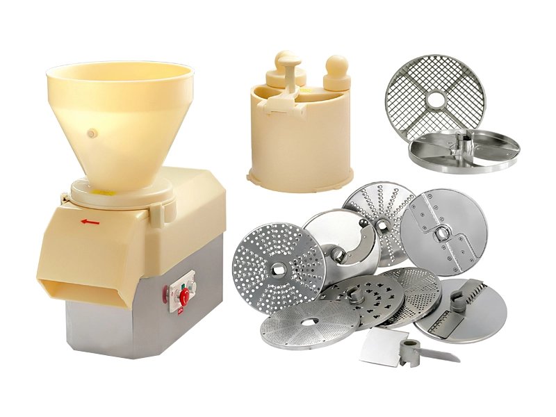 Габариты 600х300х650мм, 380В, 545Вт, в комплект входят: Диск шинковочный (нарезка соломкой 4х3 мм), Диск тонкого измельчения (для драников), Нож комбинированный (нарезка брусочками 5х10 мм), Нож для нарезки соломкой 2х2 мм (по-корейски), Диск терочный (нарезка размером 1,3х3,5 мм), Нож дисковый (нарезка ломтиками толщиной 2 мм), Решетка ножевая 10х10 (нарезка кубиками 10х10х10 мм, используется с ножом дисковым 10 мм), Нож дисковый 10 мм (нарезка ломтиками 10 мм, нарезка кубиками 10х10х10 мм, при использовании с решеткой ножевой 10х10 мм), используется на предприятиях общественного питания и торговли для нарезки сырых и вареных продуктов (картофеля, свеклы, моркови, лука, репы, брюквы, огурцов, томатов и т.д.) на частицы различной геометрической формы, тонкого измельчения картофеля, моркови, а также для шинковки капусты. Модель оснащена приводом и приспособлением для резки. Производительность при нарезке сырого картофеля кружочками(ломтиками) толщиной 10 мм – 350кг/ч, при протирке картофеля – нет, 8 видов нарезки