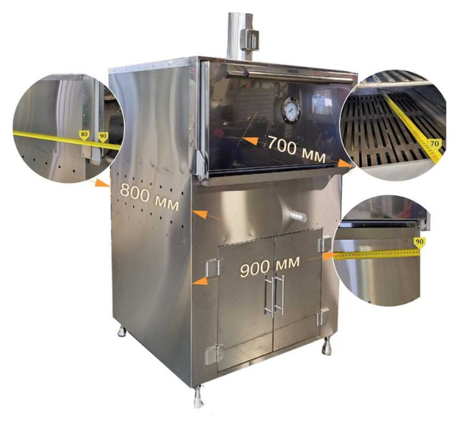 903х971х1796 мм, Рабочая температура: до 450 С, Идеально подходит для приготовления вкуснейших блюд в ресторанах от 20 до 200 посадочных мест, регулировка поддува выведена наружу, Стандартная комплектация: верхняя шиберная заслонка, нижний регулятор тяги воздуха, нижний встроенный шкаф, ящик для сбора золы, комплект колосников, термометр, 1 гриль-решетка, лоток, регулируемые по высоте ножки