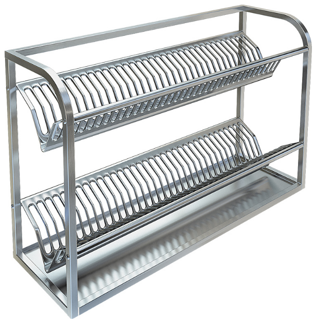 650х300х600мм, Полка настенная для сушки посуды разборная из нержавеющей стали марки AISI 304 толщиной 0,8мм, 2 ур - кассета из нержавеющей стали марки AISI 304 толщиной 0,8мм на 2х35 тарелок, поддон из нержавеющей стали марки AISI 304 толщиной 0,8мм, боковина из трубы 20х20. Полка поставляется в собранном виде.