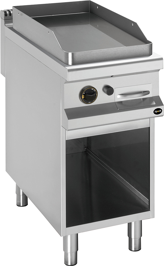 Открытая газовая сковорода Apach APTG-49PL/PL 900-й серии предназначена для обжарки мяса, рыбы и овощей на предприятиях общественного питания и торговли. Модель с закругленными краями и бортами оснащена электромеханической панелью управления с терморегулятором, горелкой с пьезоэлектрическим поджигом и системой стабилизации пламени, выдвижным лотком для сбора остатков пищи, масла и жира и открытой подставкой с регулируемыми по высоте ножками. Корпус, панель управления и вытяжная решетка выполнены из нержавеющей стали AISI 304, рабочая поверхность – из конструкционной стали, боковые и задняя панели - из нержавеющей стали AISI 430, лоток и горелка - из нержавеющей стали.
