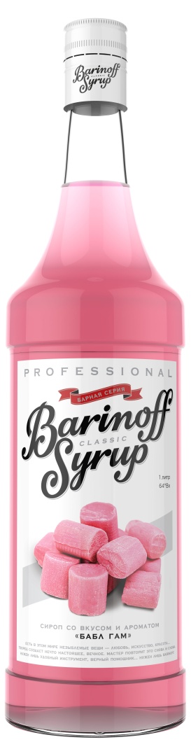 Сироп Barinoff "Бабл гам" - ярко-розовый со вкусом классической жевательной резинки. Прекрасно подходит для приготовления коктейлей и освежающих лимонадов, сочетается с газированной водой, с молочными коктейлями, десертами и с крепкими алкогольными напитками.