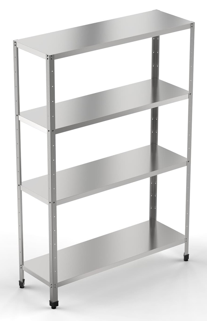 1000х600х1800мм, Стеллаж кухонный, серия "Стандарт" 4 сплошные полки выполненные из нерж. стали марки AISI 430, толщина 0,8 мм; каркас разборный - уголок из оцинкованной стали 1,5мм- толщиной.