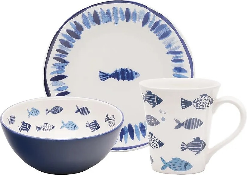 Набор посуды Oxford CARDUME 141002 CJ03-5962 используется на предприятиях общественного питания и торговли, а также в домашних условиях для подачи завтрака, закусок, супов и других блюд. Набор состоит из 3 предметов кругло ориентированной формы: кружки с ручкой, мелкой тарелки и глубокой миски. Изделия выполнены из высококачественной керамики с декорированной акварельными паттернами с рыбками глазурованной поверхностью в гармоничной комбинации белого, синего и голубого тонов.