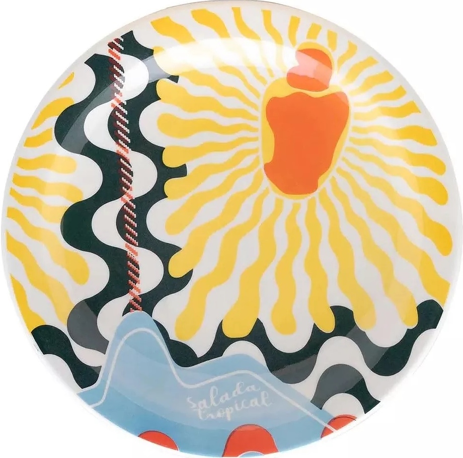 Мелкая тарелка Oxford FLOREAL Shape SALADA TROPICAL 126969 J084-6845 используется на предприятиях общественного питания и торговли, а также в домашних условиях для подачи вторых блюд. Коллекция декорирована яркими принтами с тропическими фруктами в сочетании с элементами известных бразильских достопримечательностей в стиле постмодернизма. Изделие выполнено из высококачественной керамики с глянцевой глазурованной поверхностью в комбинации желтого, черного, оранжевого и голубого тонов.
