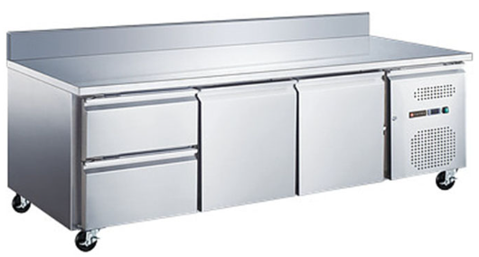 1795x700x950 мм, 230В, 0,23 кВт, 417 л, -2…+8 С, 2 двери, полки GN1/1, одна полка для каждой двери в комплекте, 2 ящика, столешница из нержавеющей стали, с бортом, боковое расположение холодильного агрегата, динамическое охлаждение, на колесах