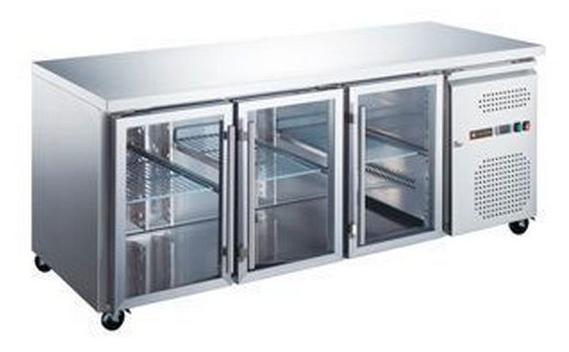1795x700x850 мм, 230В, 0,23 кВт, 417 л, +2…+8 С, 3 стеклянные двери, полки GN1/1, одна полка для каждой двери в комплекте, столешница из нержавеющей стали, без борта, боковое расположение холодильного агрегата, динамическое охлаждение, на колесах