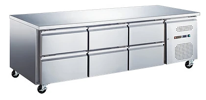 1795x700x850 мм, 230В, 0,23 кВт, 417 л, -2…+8 С, 6 ящиков, столешница из нержавеющей стали, без борта, боковое расположение холодильного агрегата, динамическое охлаждение, на колесах
