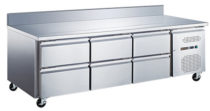1795x700x950 мм, 230В, 0,23 кВт, 417 л, -2…+8 С, 6 ящиков, столешница из нержавеющей стали, с бортом, боковое расположение холодильного агрегата, динамическое охлаждение, на колесах