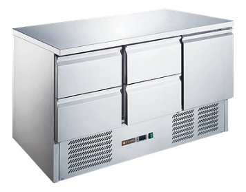 1365x700x876 мм, 230В, 0,24 кВт, 368 л, +2…+8 С, 1 дверь, 2 + 2 ящика, полка GN1/1, одна полка в комплекте, столешница из нержавеющей стали, без борта, нижнее расположение холодильного агрегата, вентилируемое охлаждение