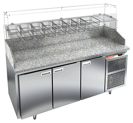 1835х700х850мм, PZ3-111/GN КАМЕНЬ стол для пиццы охл.(+2+10), 3 двери, с бортом с 3х сторон, 1835х700х850мм