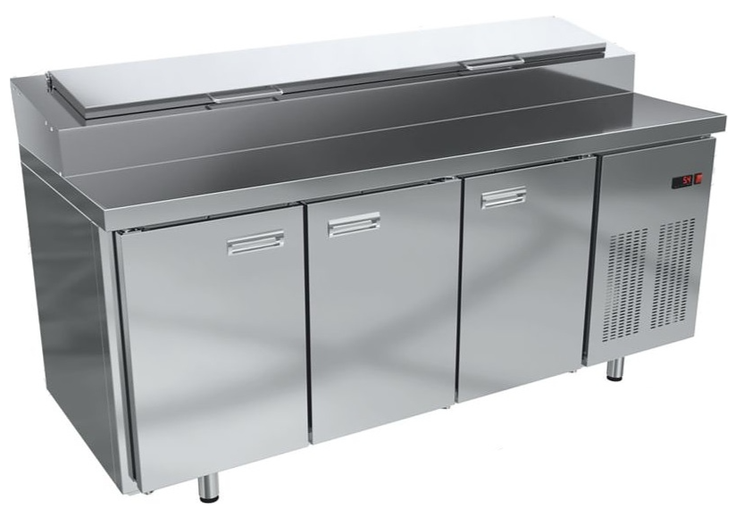 Стол холодильный для пиццы KRONER СХП 3-180-70 используется на предприятиях общественного питания и торговли для раскатки теста и обработки ингредиентов, используемых для приготовления пиццы, салатов и других блюд, а также для охлаждения и хранения продуктов и напитков. Благодаря размщению гастроемкостей на подиуме, все охлажденные ингридиенты находятся у повара под рукой.