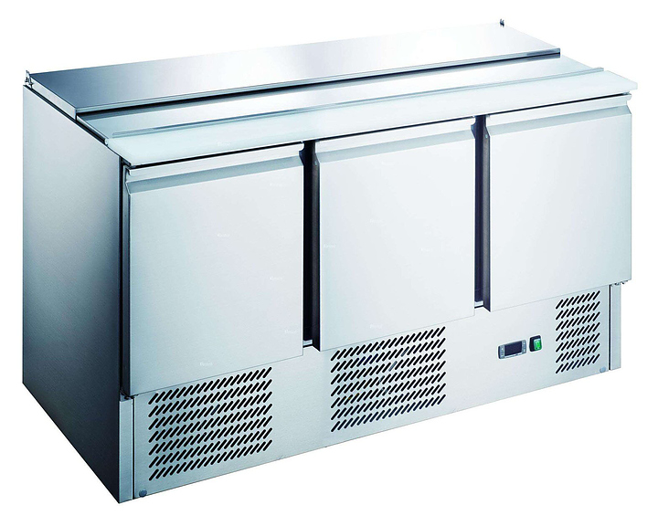 Холодильный стол для салатов Hurakan HKN-SL3 предназначен для обработки ингредиентов, используемых для приготовления салатов, охлаждения и кратковременного хранения скоропортящихся продуктов и напитков на предприятиях общественного питания и торговли. Модель оснащена тремя дверьми, отсеками для гастроемкостей и 2 плоскими верхними панелями. Столешница изготовлена из нержавеющей стали.