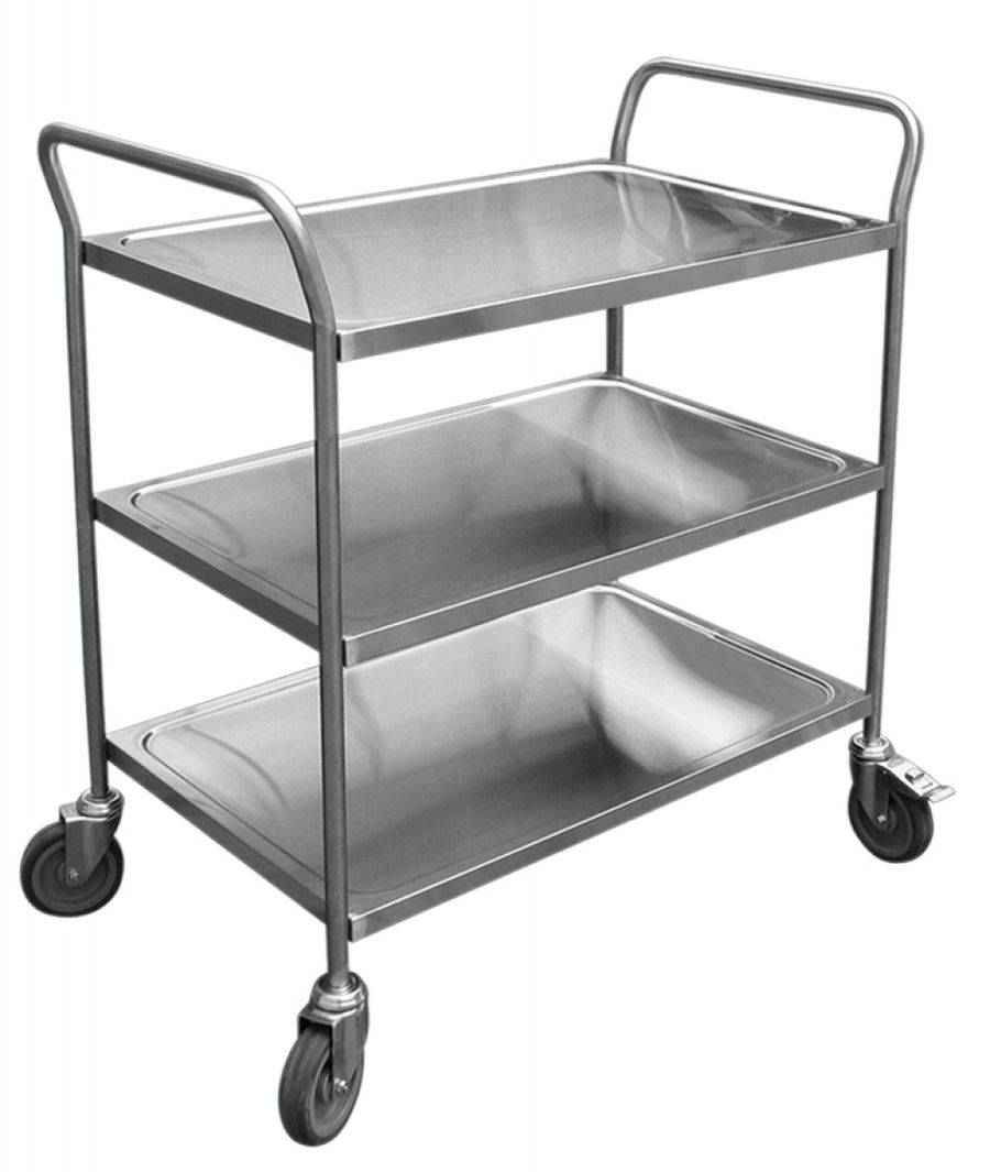 Сервировочная тележка Abat ТС-80 предназначена для транспортировки столовых приборов, тарелок с готовыми блюдами, грязной посуды и на предприятиях общественного питания и торговли. Модель оснащена 2 фиксированными и 2 поворотными колесами. Конструкция выполнена из высококачественной нержавеющей стали