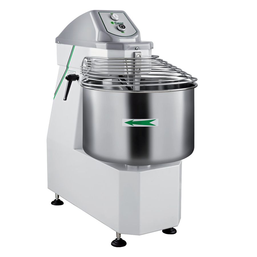 Спиральный тестомес с подъемной траверсой и фиксированной дежой. Машина для обработки различных видов теста, особенно подходит для мягкого теста, такого как хлеб, пицца, лепешки. Конструкция покрыта краской, устойчивой к царапинам; - детали, контактирующие с пищей, такие как дежа, спираль и тестоделительный стержень, изготовлены из нержавеющей стали; - предохранительный микровыключатель на крышке чаши; - крышка из дымчатого поликарбоната в стандартной комплектации.