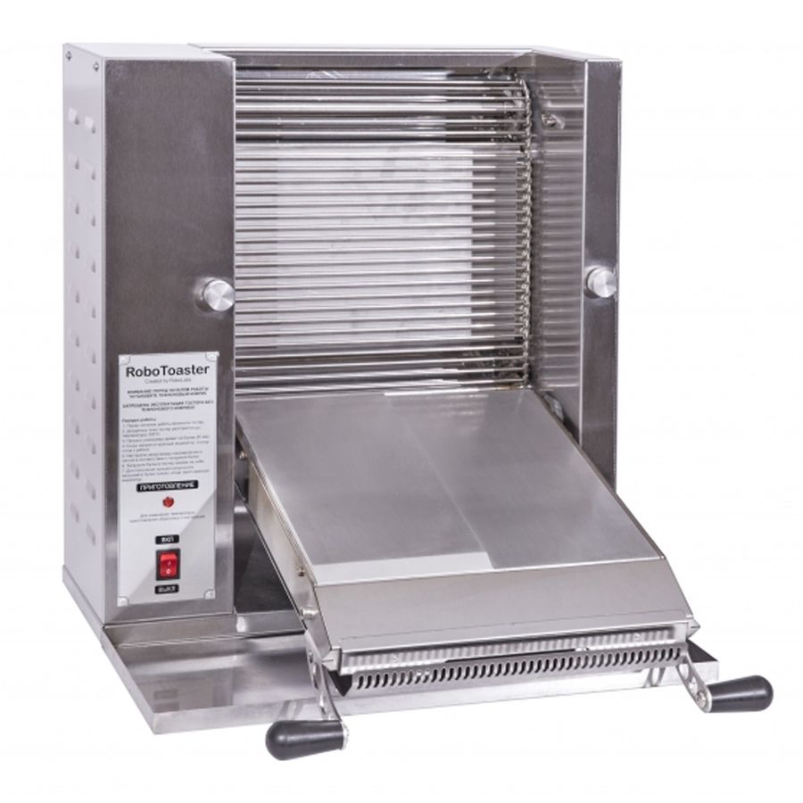 Тостер контактный конвейерный вертикальный с электромеханическим управлением RoboLabs RoboToaster предназначен для карамелизации булочек. Модель имеет конвейерную сетку из нержавеющего прутка диаметром 4мм, наклонную рабочую плоскость для удобства загрузки, съёмные наклонный лоток для булок, с возможностью установки в двух направлениях. Алюминиевая нагревательная поверхность обеспечивает быструю и равномерную карамелизацию булок. Сахар, входящий в состав булочек, под действием высокой температуры образует золотисто-коричневую корочку на срезе половинки булки. В дальнейшем, при формировании бургера эта корочка способствует тому, что соус не проникает глубоко в булочку, не размачивает изделие и не деформирует его. Сама же булочка при прохождении через тостер не подогревается и, таким образом, не пересушивается. Регулируемый зазор между нагревательной поверхностью и сеткой позволяет карамелизовать разрезанные булки толщиной до 40 мм, а минимальный выставляемый зазор составляет 5 мм. Контактная часть, тефлоновый коврик, является расходным материалом, в комплекте поставляются два коврика. Тостер оборудован лотком для хранения готовых булочек.