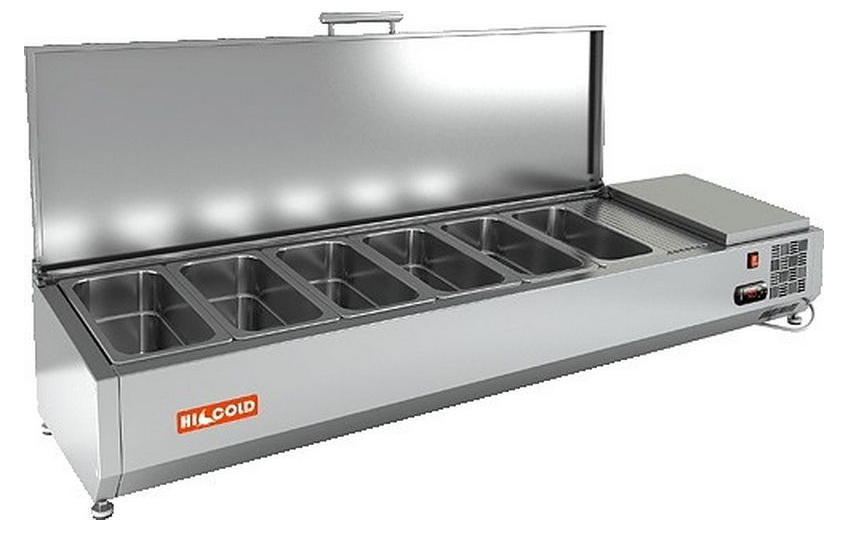 Витрина холодильная HICOLD VRTU 1485 предназначена для демонстрации, охлаждения и кратковременного хранения салатов, гарниров, закусок и других блюд на предприятиях общественного питания и торговли.