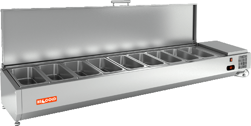 Витрина холодильная настольная HICOLD VRTU 1915 1/4 предназначена для демонстрации, охлаждения и кратковременного хранения салатов, гарниров, закусок и других блюд на предприятиях общественного питания и торговли.