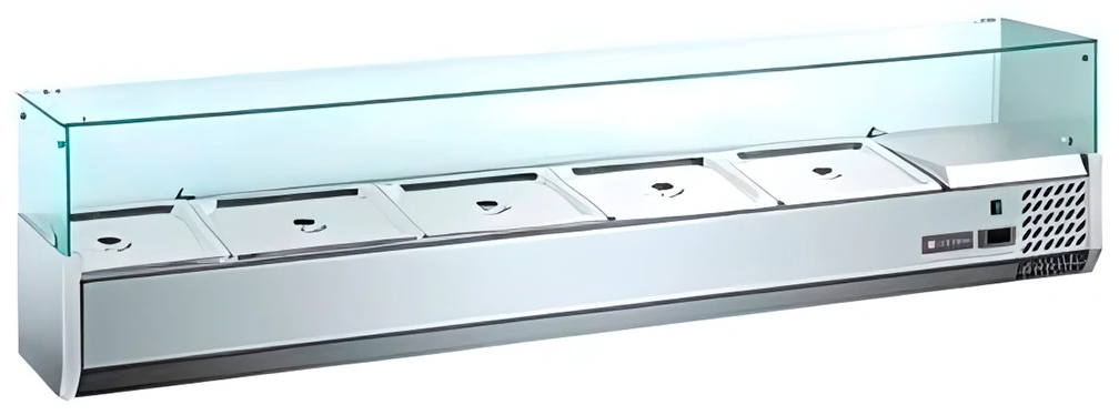 Витрина холодильная настольная Tatra TVR1500-6GN1/3 предназначена для использования на предприятиях общественного питания и торговли для демонстрации и кратковременного хранения ингредиентов, салатов, закусок и готовых блюд. Витрина оснащена встроенным холодильным агрегатом с боковым расположением и статической системой охлаждения. Температурный режим холодильной витрины +2/+8 С. Для установки рабочей температуры предусмотрен цифровой термостат. Изделие выполнено из нержавеющей стали и имеет стеклянный козырек и регулируемыми ножки. Вместимость модели 6 гастроемкостей GN 1/3 с максимальной глубиной 150 мм.