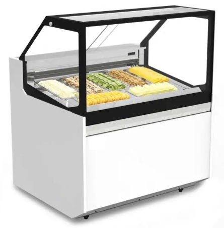 Витрина для мороженого CARPINI RITA RT 10 с превосходной обозримостью продукта и значительным наклоном поверхности выкладки. Фронтальное и боковое остекление: стеклопакет, система антизапотевания, внутренняя LED подсветка, раздвижные дверцы со стороны продавца.
