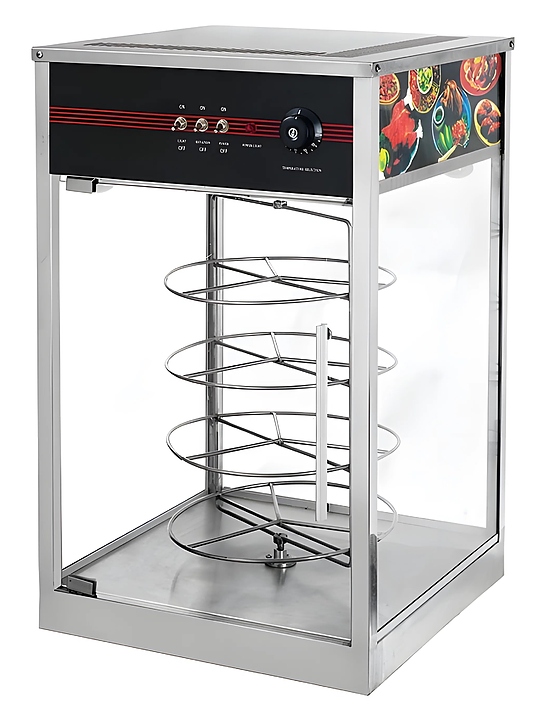 Автоматическое вращение полок: Модель оснащена четырьмя автоматически вращающимися уровнями выкладки диаметром 380 мм, что позволяет покупателям рассмотреть блюда со всех сторон.